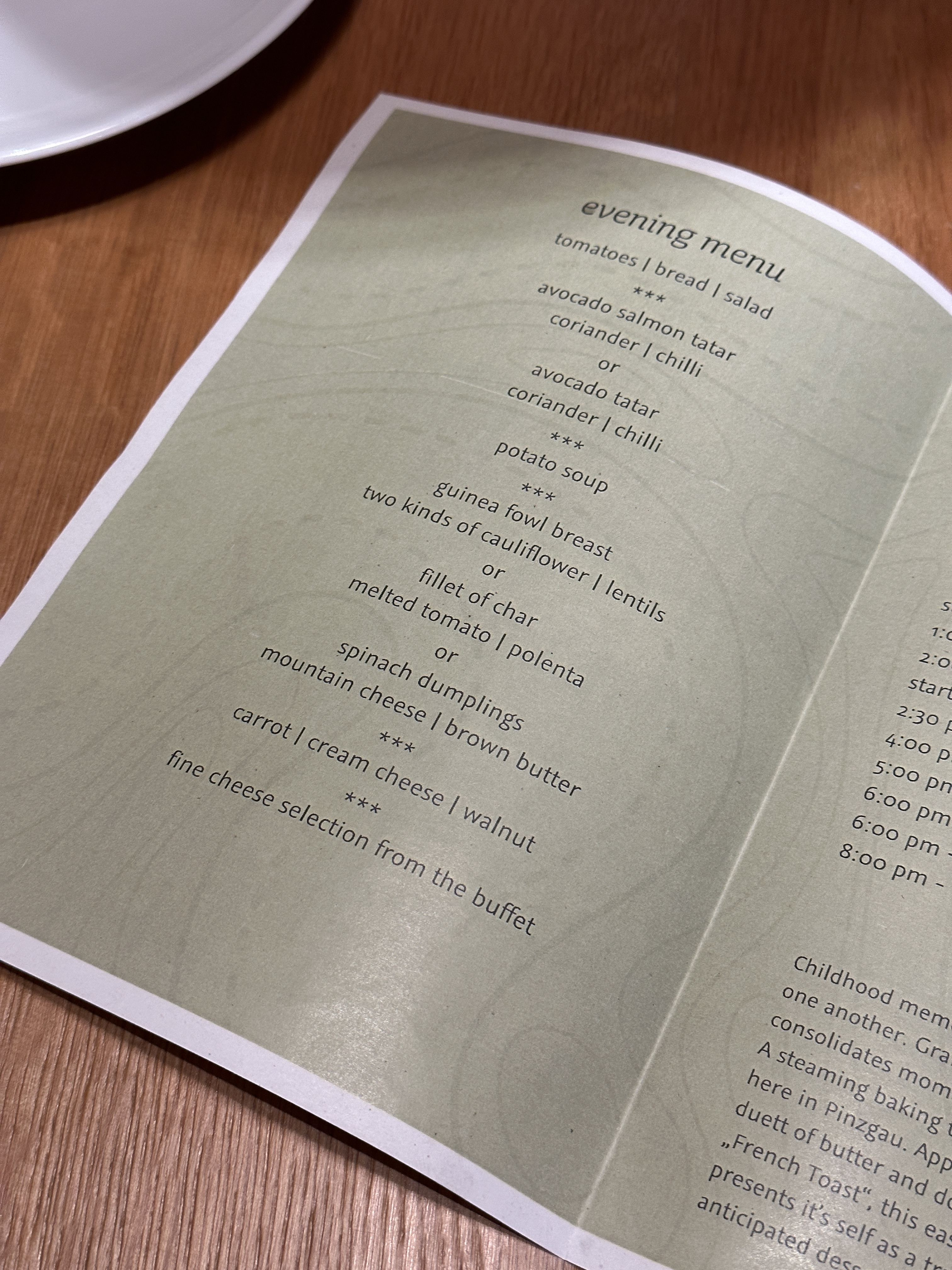 The restaurant, as I said before, is spectacular. Every day there’s a different five-course menu: salad, starter, soup, main course and dessert (you can book dinner included if you’re staying at the hotel). The service is also wonderful, and the attention to detail really surprised me. The table was the same every day per room, so breakfast and dinner were always in the same corner – which made me feel at home.